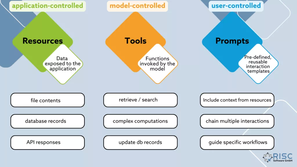 A typical MCP setup consists of an AI-enabled application – such as an IDE plugin, a chat frontend or a desktop app that acts as an MCP client and triggers all tool calls. Examples of this are