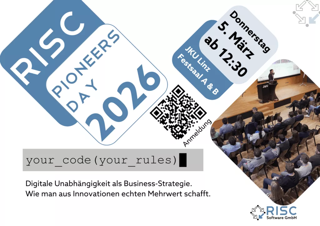 Wir laden Sie wieder recht herzlich zum RISC Pioneers Day 2026 unter dem Motto „Your Code, Your Rules – Digitale Unabhängigkeit als Business-Strategie. Wie man aus Innovationen echten Mehrwert schafft“ ein. Dabei werden zahlreiche Beispiele gezeigt, wie man innovative Ideen nicht nur bis zu Prototypen, sondern bis zu einer produktreifen Lösung entwickelt, die dann echten Mehrwert für Unternehmen schafft und dabei zu einem wichtigen Wettbewerbsvorteil und digitaler Souveränität beiträgt.